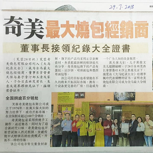 奇美烧包有限公司成立于1976年,经过黄氏夫妇努力不懈的奋斗,由原先只有数名员工的贸易公司,演变为今时今日在全马拥有超过200多个分销商的食品企业。 多年来,奇美烧包除以传统手工制造的烧包驰名以外,其他的产品例如蛋挞、豆沙饼也已拥有了一定的口碑,并且广受大众的喜爱。